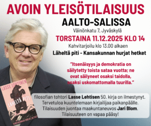 Kaikille avoin yleisötilaisuus Aalto-salissa. Tervetuloa kuuntelemaan filosofian tohtori Lasse Lehtistä Aalto-salille. Suositun tarinan kertojan 50. kirja on ilmestynyt syksyllä ja tilaisuuden aihe on kirjan otsikon mukaan ”Läheltä piti- Kansakunnan hurjat hetket”. Tilaisuuden juontaa maakuntaneuvos Jari Blom. Kahvitarjoilu alkaa klo 13.30 ja varsinainen tilaisuus klo 14.00, tervetuloa.