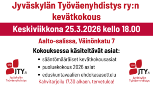 « Kaikki Tapahtumat JYVÄSKYLÄN TYÖVÄENYHDISTYS RY:N KEVÄTKOKOUS KE 25.3.2026 KLO 18.00. 25 maaliskuun @ 18:00 - 20:00 « JYVÄSKYLÄN TYÖVÄENYHDISTYS RY. YLEINEN KOKOUS 18.2.2026 KLO 18.00 SEELA SELLA AALTO-SALISSA 14.4.2026 KLO 14 » Jyväskylän Työväenyhdistys ry:n kevätkokous Aalto-salissa keskiviikkona 25.3.2026 klo 18.00. Kahvitarjoilu 17.30 alkaen Käsiteltävät asiat: Sääntömääräiset kevätkokousasiat Puoluekokous 2026 asiat Eduskuntavaalien 2027 ehdokasasettelu Tervetuloa! Lisää kalenteriin Google-kalenteri iCalendar Outlook 365 Outlook Live Tiedot Päivämäärä: 25 maaliskuun Aika: 18:00 - 20:00 Järjestäjä Jyväskylän Työväenyhdistys Tapahtumapaikka Aalto-sali Väinönkatu 7 Jyväskylä, Suomi + Google Map